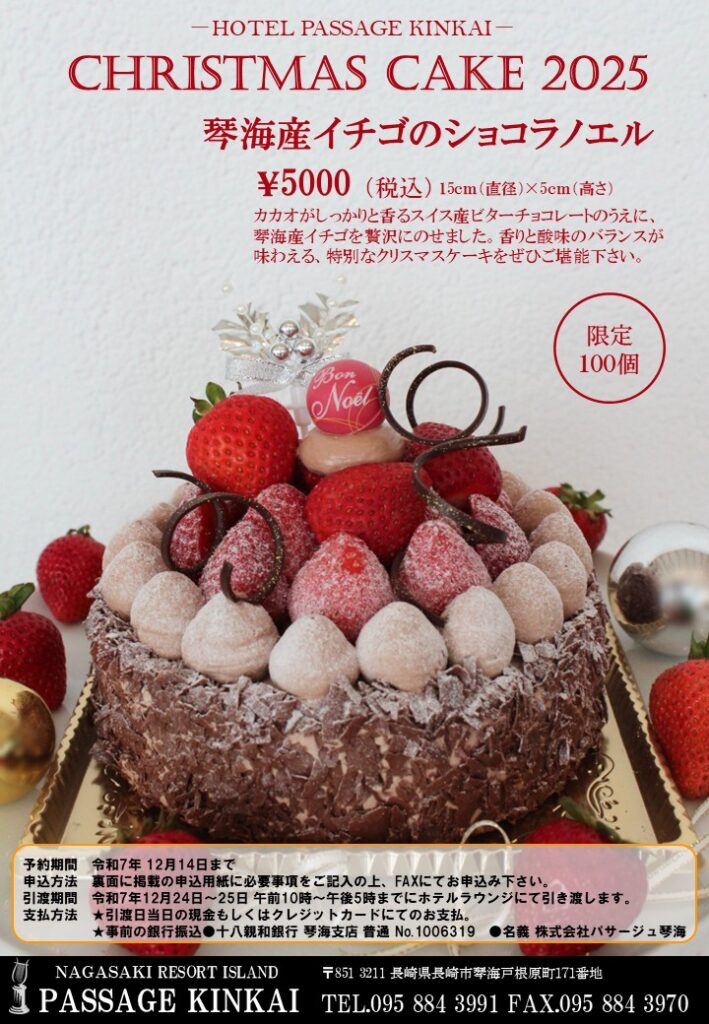 パサージュ琴海だけの特別なクリスマスケーキをご準備しております。毎年人気のクリスマスケーキご予約お待ちしております。